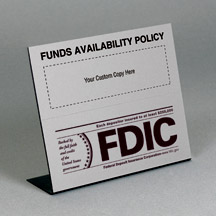 Customize this sign with your own Funds Availability information! High quality magnetic mandatory signs are a great alternative to wall mounting – no need for a frame! There’s no need to purchase a new sign when updates take place! New updates are easily switched out with a replacement magnetic strip. Magnetic strips attach easily to a steel counter-top piece and work perfectly at teller lines or on desktops. Color-match signage to match your decor and/or brand (additional cost). Please email your custom copy to Customer Service Typesetting fee applies.