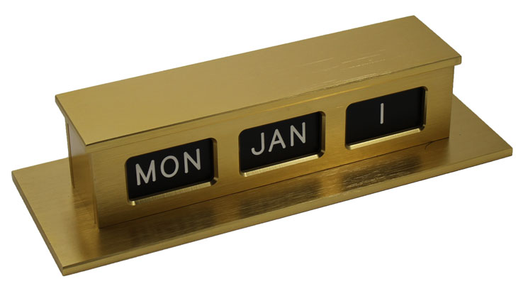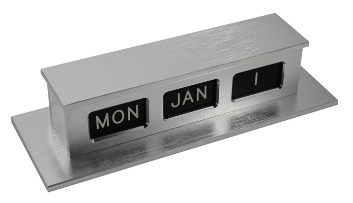 The Double-Sided Self-Storing Perpetual Counter Calendar is perfect for bank or credit union lobbies; it will remind customers of the correct date when writing checks, contracts, or signing other important documents. Made of sturdy brushed aluminum, the date can be easily changed by removing the top panel and changing the date inserts. The top panel also allows for the storage of unused inserts. The calendars can be purchased in chrome, black, or brass-colored aluminum. Date panels are engraved on Rowmark material, black with white lettering or white with black lettering. The non-slip bottom will prevent the calendar from slipping or scratching surfaces. 4″ X 11″ X 2 1/2″.